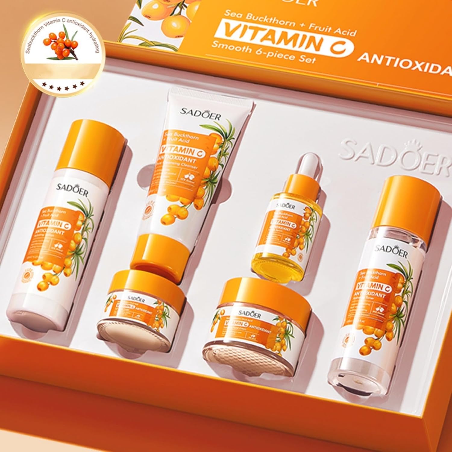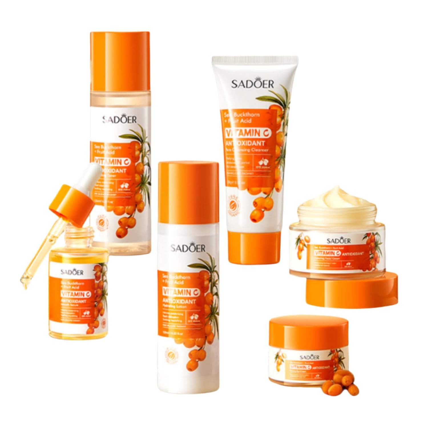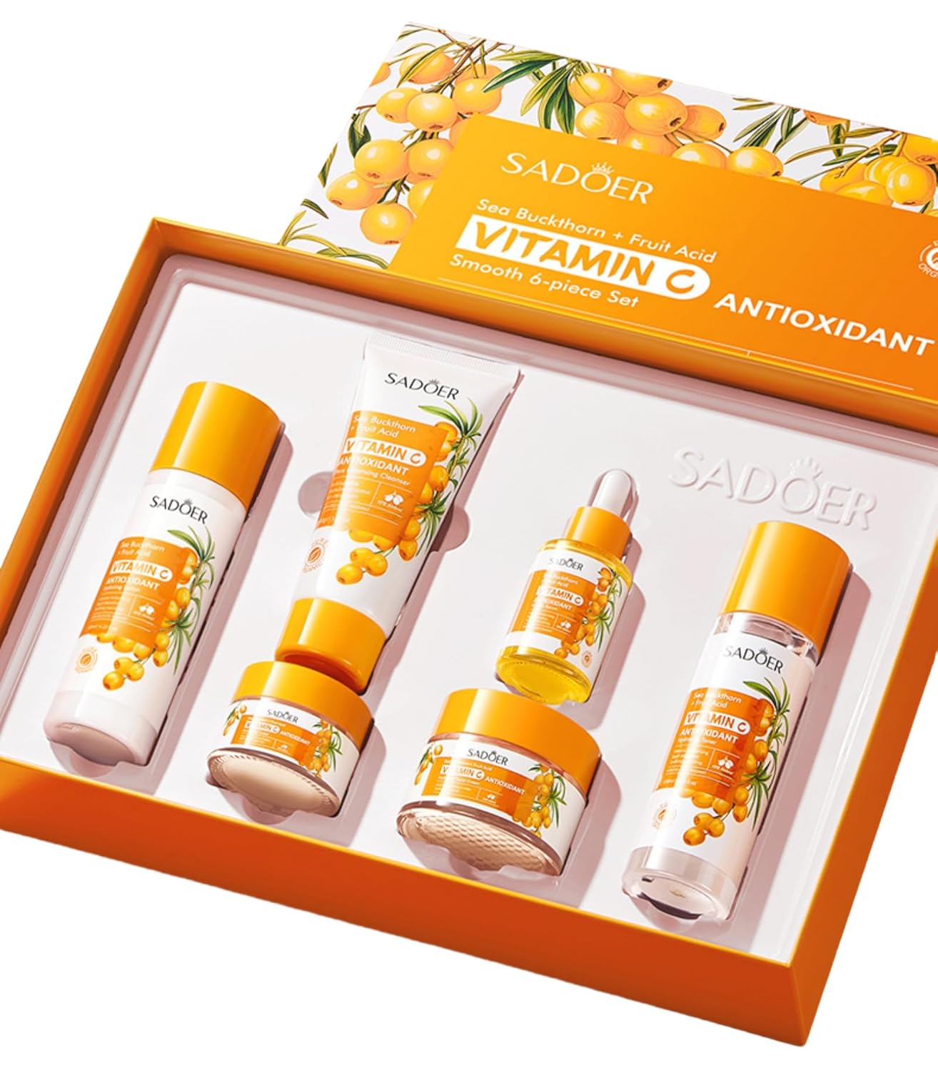 Coffret de soins du visage à l’argousier et à la vitamine C. Soin visage, kit de soins, soin nettoyant et hydratant. Contient : lotion nettoyante, tonique, crème visage, contour des yeux, sérum.