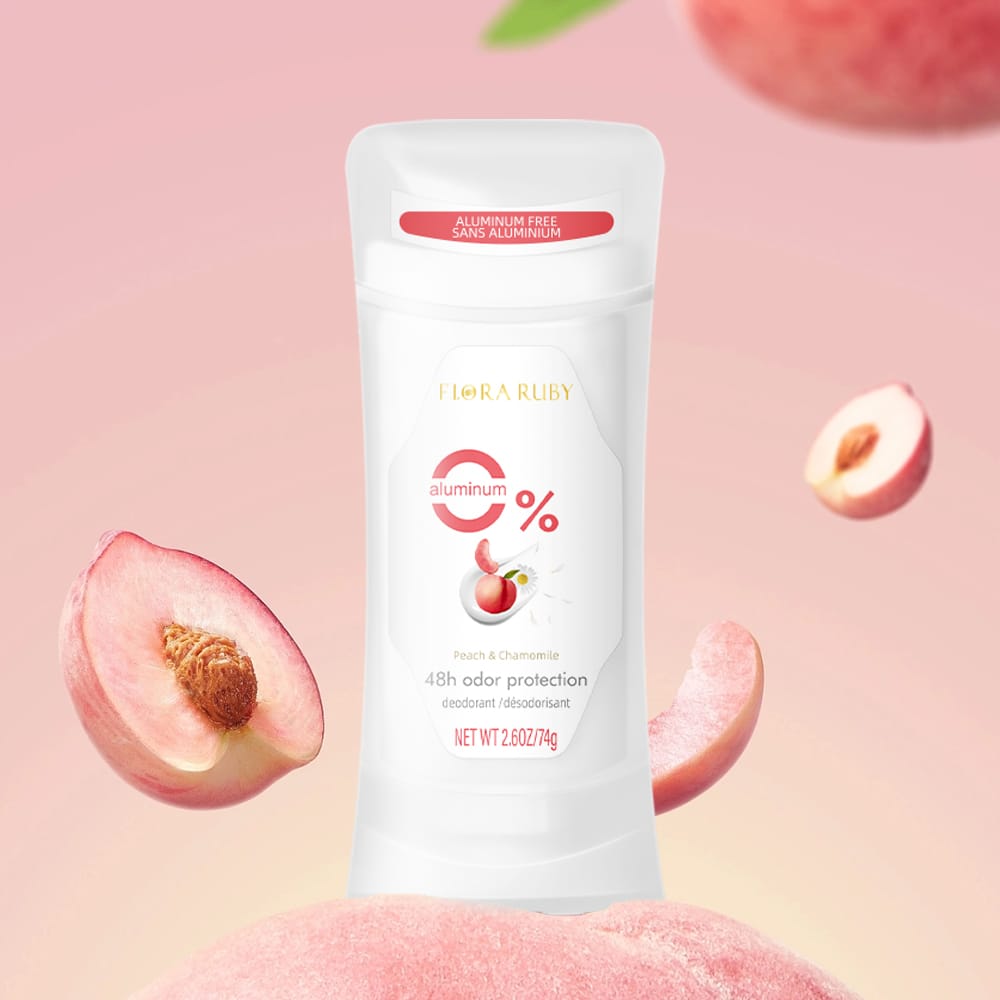 Associez gourmandise et soin avec le stick déodorant Flora Ruby Pêche & Camomille.